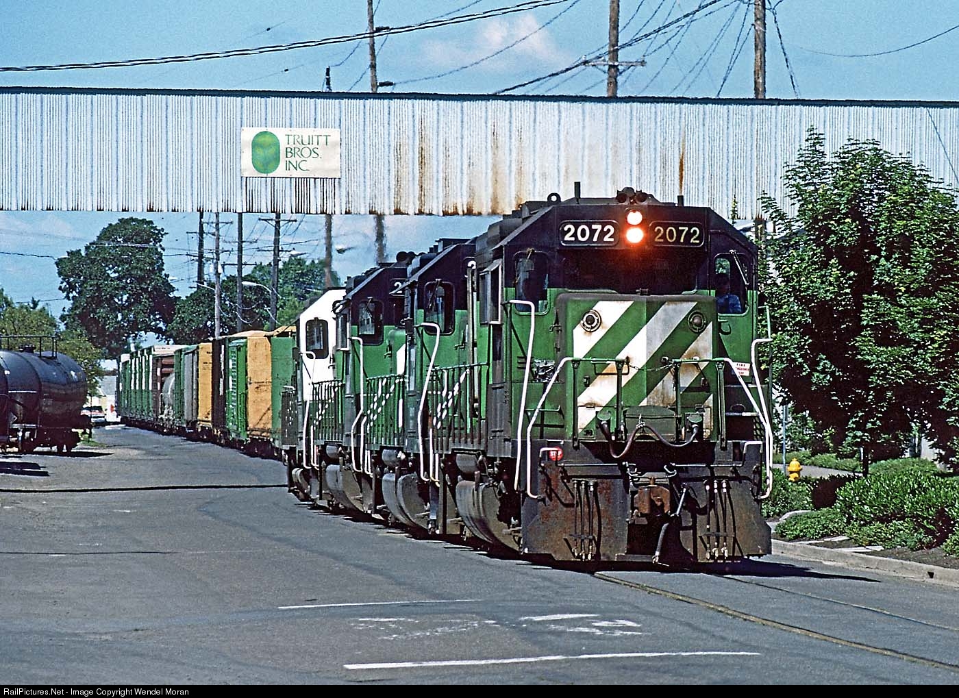 The daily Oregon Electric roadfreight from Vancouver, Washington to Albany, Oregon rolls down Front Street on a spring afternoon. The lead unit was ordered by Spokane, Portland & Seattle. It was delivered to Burlington Northern as one of the first new BN locomotives.