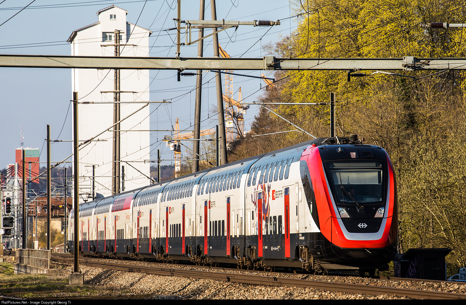 | "FVD" doubledeck train RABDe 502 # 006 "Olten" is leaving Winterthur as IR 3278 of the line IR13 from Chur via St.Gallen to Zürich. In the background the Neumühle grain elevator (not used anymore) and the Red Tower near Winterthur main station. |