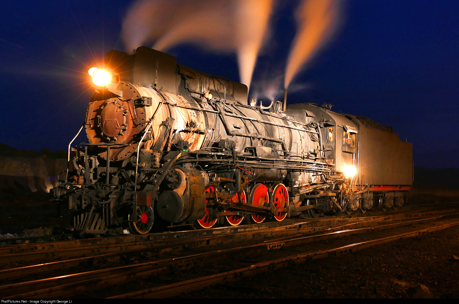 In the last bastion of mainline Chinese steam, a Class JS 2-8-2 Mikado simmers away during crew change in the pre-dawn hours at Keng Kou Station