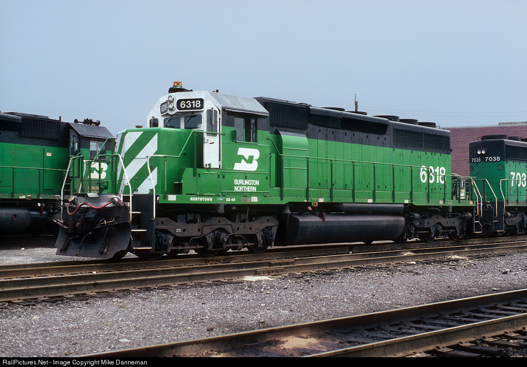 | Burlington Northern EMD SD40 No. 6318 displays a hybrid paint scheme at the locomotive facility at Cicero Yard on August 25, 1990. The standard paint scheme that BN had at since the beginning with a white-striped nose is combined with a “white face” cab front that was used on a new variation of the Cascade green scheme in 1989. |