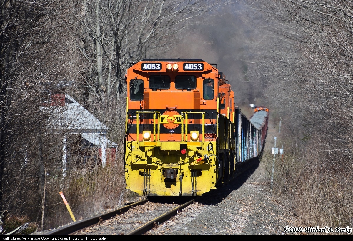 After being loaded with stone at Tilcons Reeds Gap quarry, Providence & Worcester train CT-1 led by three C40-8s, climb the grade towards Williams Road in Wallingford. The train is headed for Cedar Hill yard in North Haven. Later at night, a new crew operating as train CHFP will make the trip to Fresh Pond yard in Queens, NY.