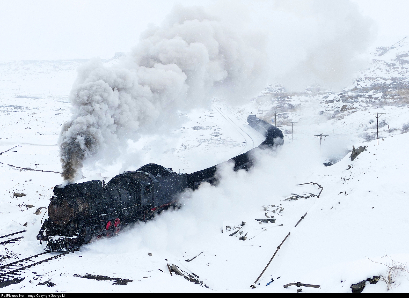 The biggest snow storm in 5 years has arrived at Sandaoling Coal Mine Railway but that hasn't stopped the trains. Here we see a loaded coal drag marching up the near 1.5% grade as it curves towards Keng Kou Station