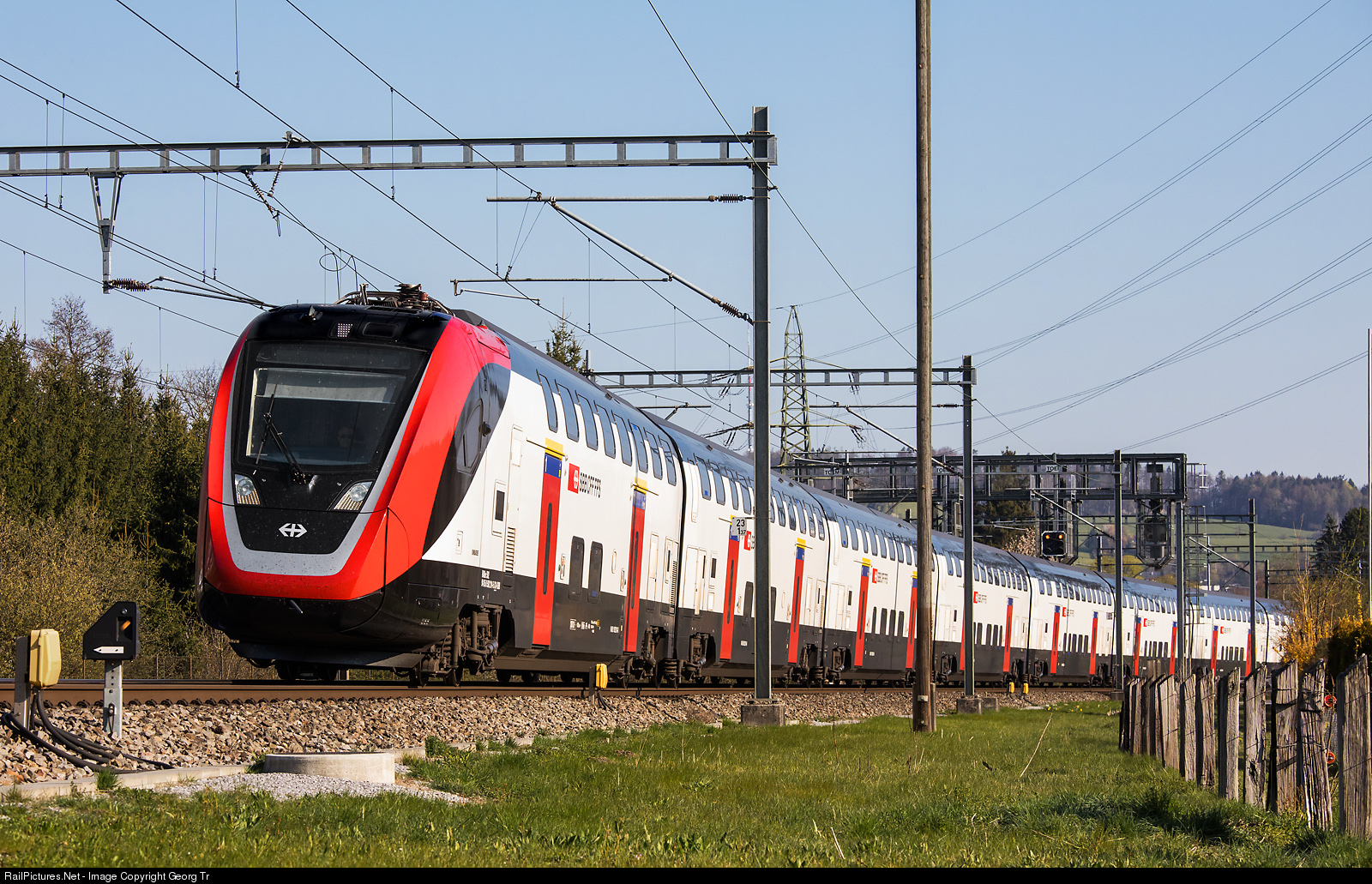 | "FVD" doubledeck train for long distance services RABe 502 # 215 of the SBB is running the IR 3260 of the line IR 13 from Chur via St.Gallen to Zürich through Winterthur Tössmühle at 125 km/h. |