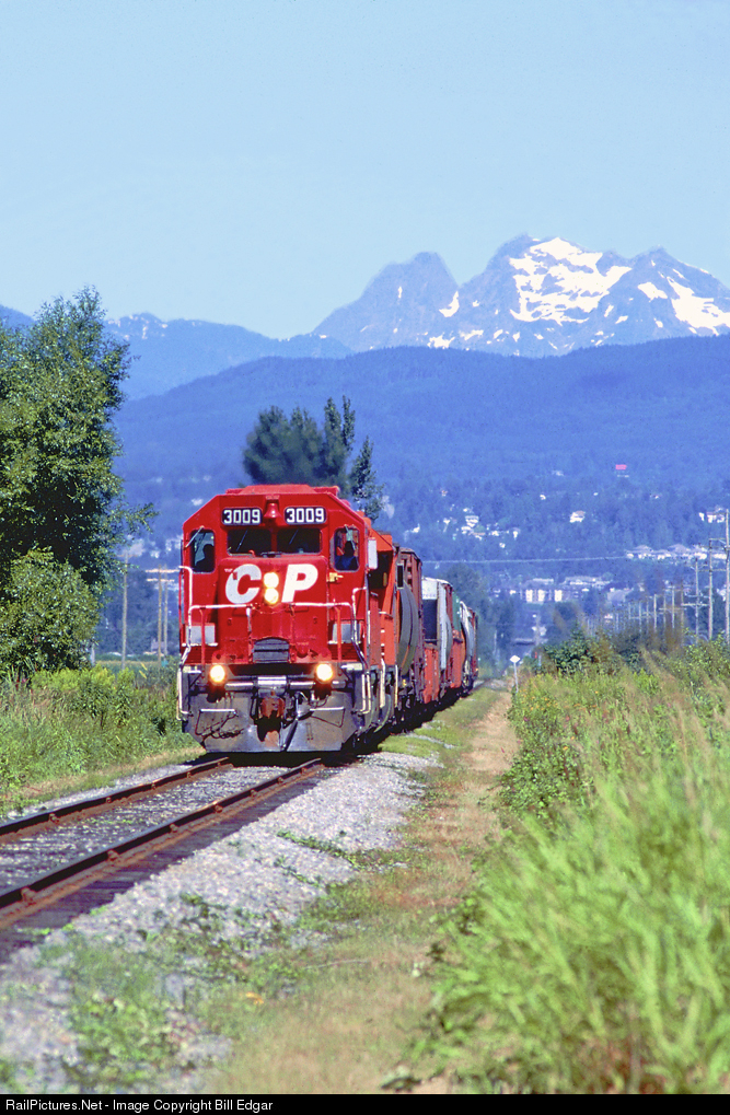 CP 3009 and a sister GP38 have a short train headed south from Mission, BC to the U.S. border at Sumas, WA with the Sumas Turn out of Coquitlam Yard east of Vancouver. The daily turn primarily handles interchange traffic with BNSF at Sumas, WA/Huntingdon, BC.