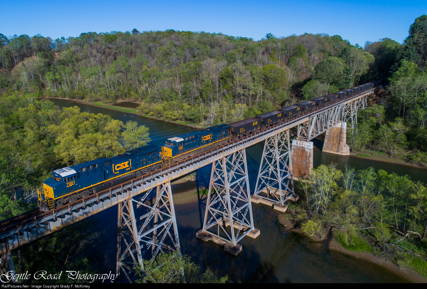 | CSXT 7001, fresh of it's recent rebuild leads empties off the FEC (Jacksonville) northbound along the former Clinchfield mainline crossing the Catawba River. These trains usually feature complete sets of company cars and this one did not disappoint. |