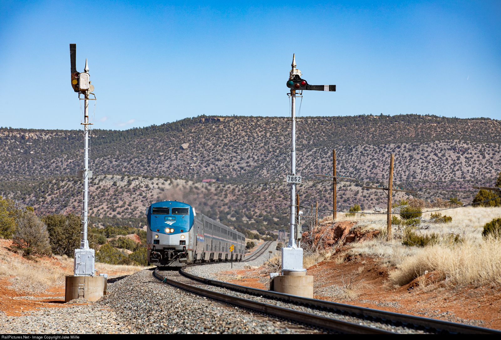 | After crossing Tecolote Creek, Amtrak's Southwest Chief splits a pair of classic semaphore signals in the desolate high-deserts of Northeastern New Mexico. These intermediate signals at mile post 786.2 are some of the more remote signals along the old Santa Fe Mainline. The lack of modern development along with the semaphores and old code line show how time stands still in this part of America. |