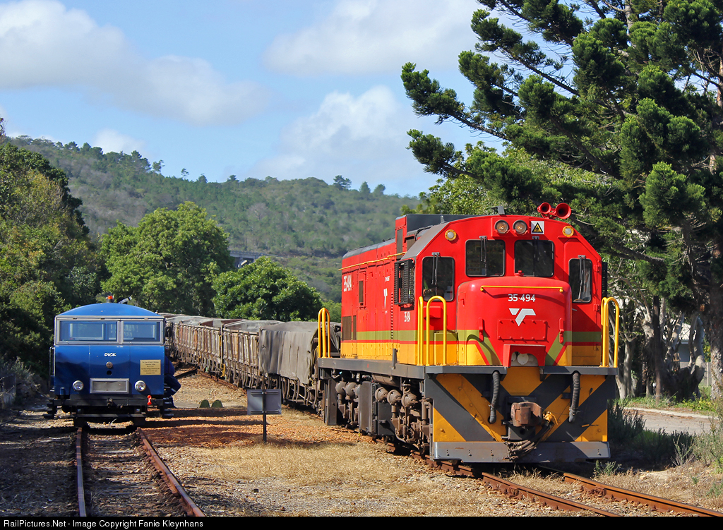| A clean looking 35494 leads a short train from George to Voorbaai, passing the Diaz Express parked in the loop at Groot Brakrivier station while we enjoyed lunch at the station restaurant. |