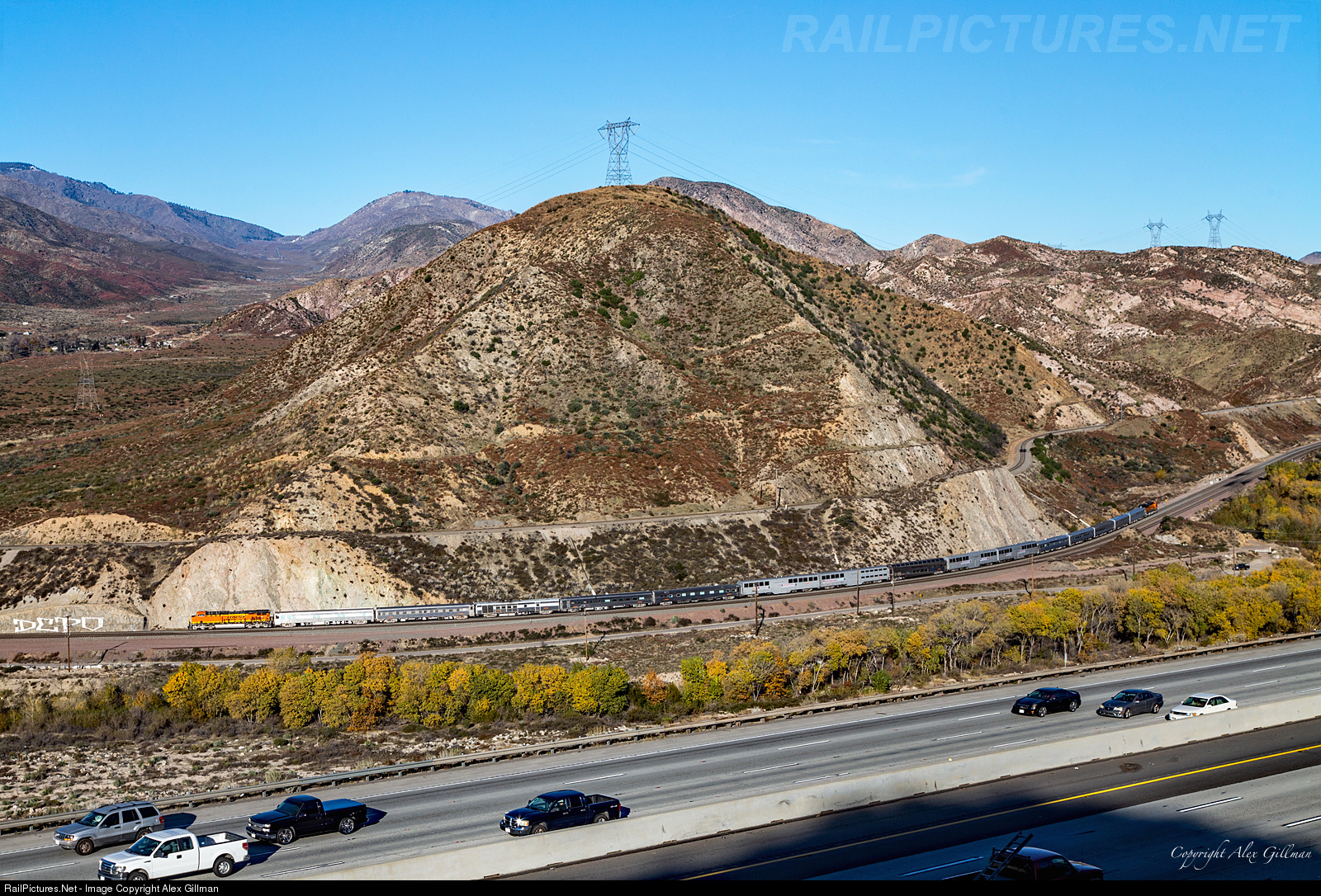 Catching the warm embrace of sunlight on this cool, winter morning, BNSF's 2019 Southern California Christmas Train bends around the hillside just east of the Swarthout Canyon Road grade crossing. In the foreground are the westbound lanes of Interstate 15, which although much faster, still doesn't deter folks from traversing a section the original Route 66 that travels through Blue Cut alongside the tracks.