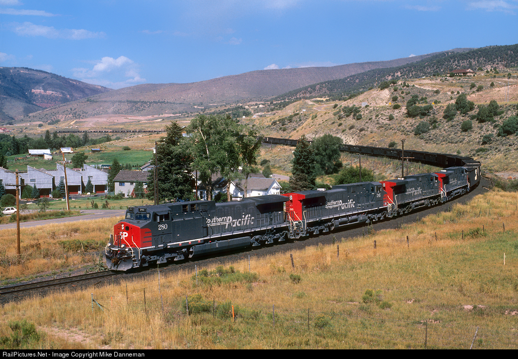 An eastbound Southern Pacific coal train curves through Edwards, Colorado, on September 5, 1995. Located on the Tennessee Pass route, the town of Edwards is about eleven miles west of Minturn in the valley of the Eagle River. Besides the railroad not operating here anymore, urban growth has also changed this scene greatly.