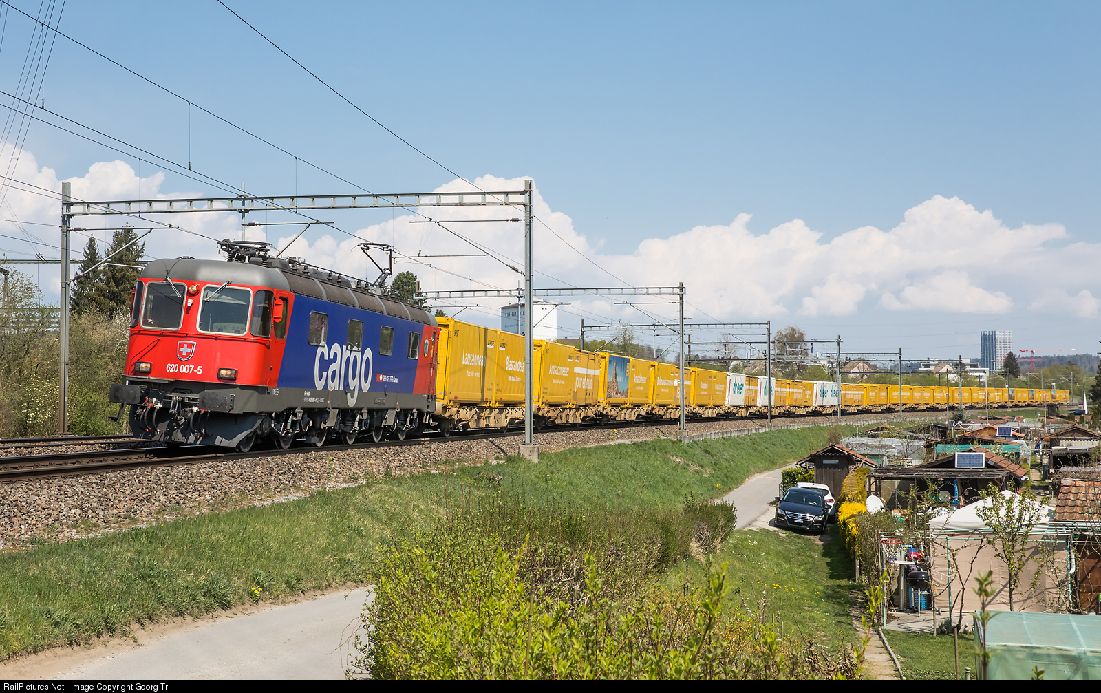 Record-breakingly long parcel post train 50972 on Easter Monday with 23 Lgnss cars and a train length of almost 400 metres. Pulling is Re 620 # 007 (Re 6/6 # 11607) "Wattwil" between Winterthur and Winterthur Tössmühle. The train ran from the Frauenfeld parcel sort center via Härkingen (parcel sort center for the middle of Switzerland) to Daillens parcel sort center for the western part of Switzerland. The journey is about 4 1/2 hours with a maximum velocity of 120 km/h.