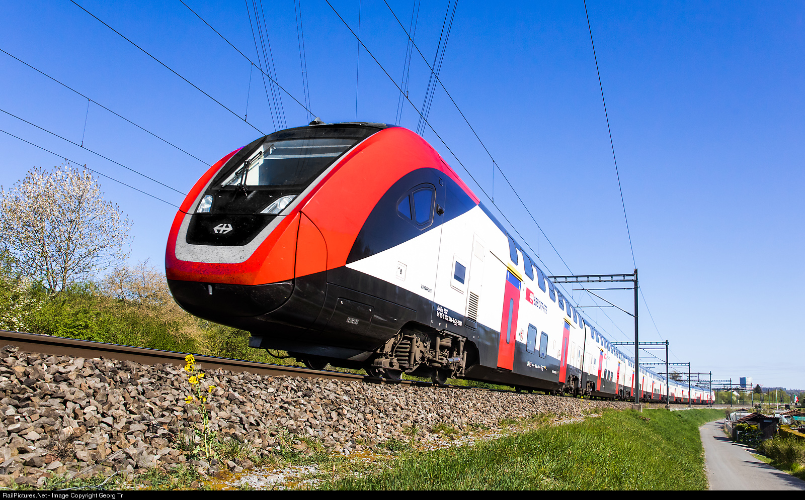 | "FVD" RABe 502 # 214 of the SBB, a Bombardier Twindexx Swiss-Express doubledeck "IR200", is running the IR 3262 of the line IR13 from Chur via St.Gallen to Zürich, between Winterthur and Winterthur Tössmühle at 125 km/h.