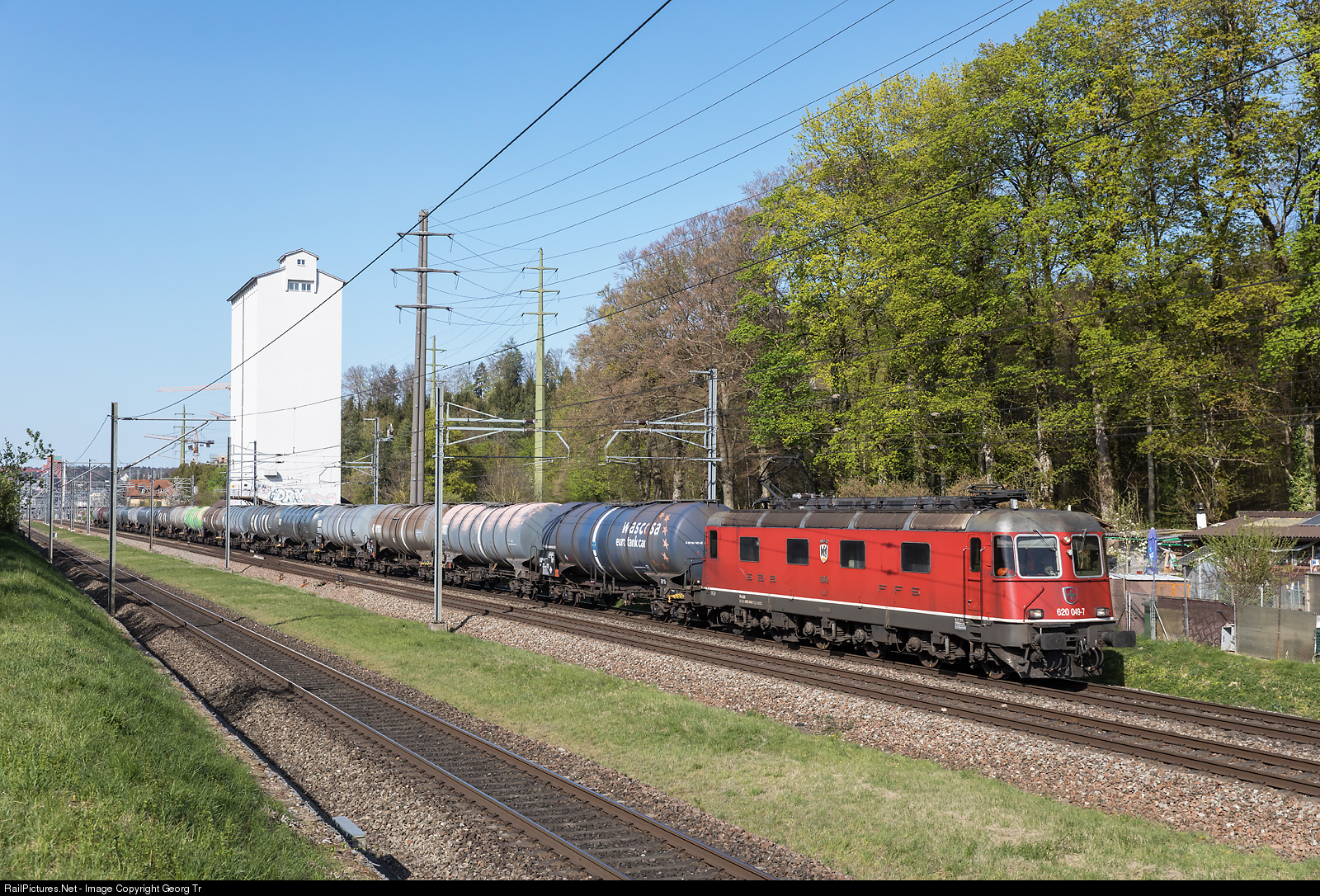 | Re 620 # 049 (Re 6/6 # 11649) "Aarberg" is pulling the empty tank car train 66448 from Schwarzenbach via Winterthur-Kloten-Regensdorf-Bözberg to Basel Badischer Bahnhof shunting yard, leaving Winterthur. |