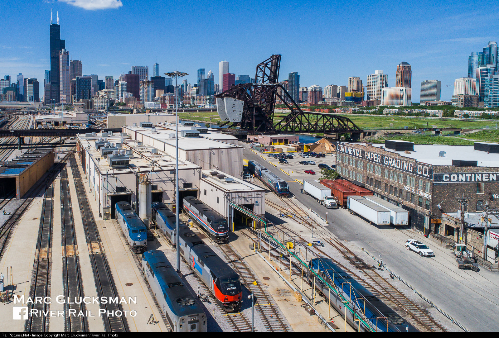 Always check the usual suspects. June 16, 2017, the Amtrak Yard in Chicago was filled with interesting units. Both P42s 156 (Phase I) and 145 (Phase III) sat in front of the locomotive shop amongst a sea of Phase V painted units, while SC-44 sits without any markings added yet. The Chicago skyline, the St. Charles Air Line, and the Continental Paper Grading Company all add to the setting.