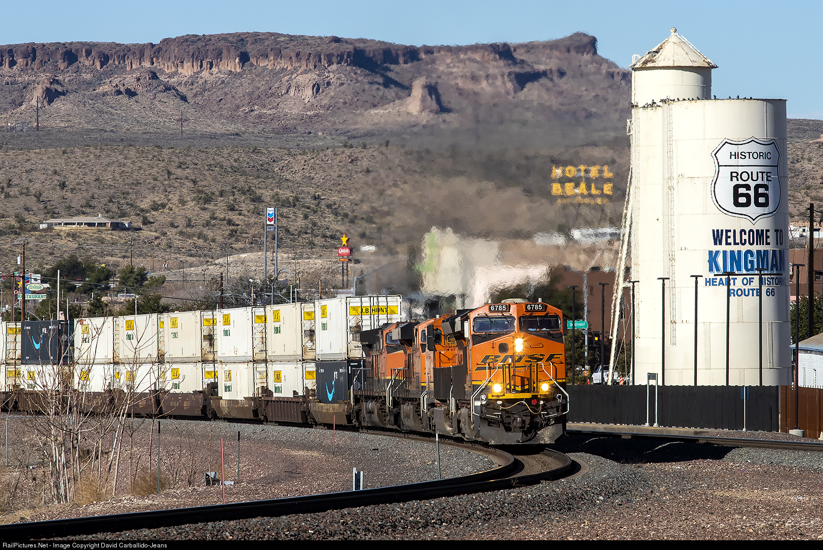 | The San Bernardino, CA to Willow Springs, IL Z-train grinds up the grade out of Downtown Kingman as it parallels historic Route 66. |