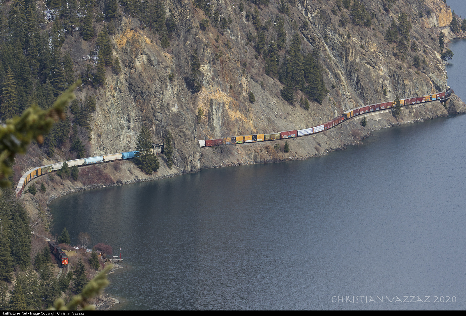 | 3 days before CN abolished all jobs between Williams Lake and Squamish for the foreseeable forte, the daily Southbound skirts the shores of Anderson Lake approaching the small town of D'Arcy, BC |