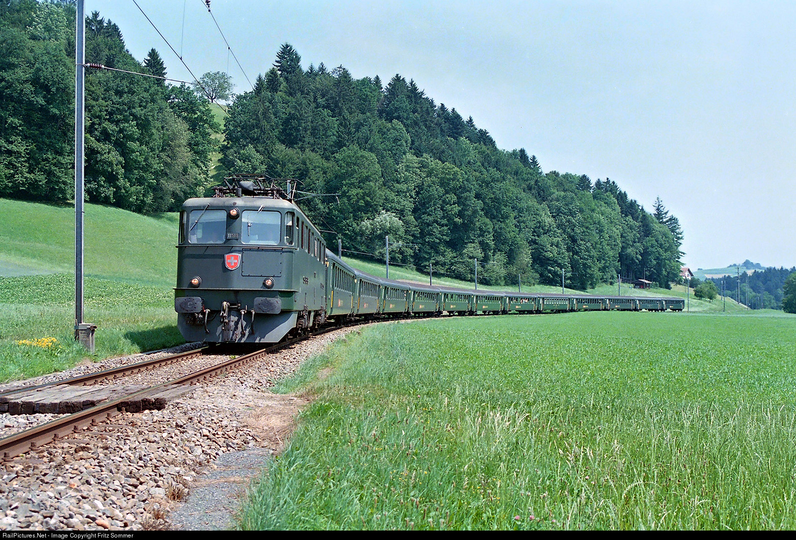 | In the summer of 1994, the largest national federal camp "Cuntrast 94" of the Pfadi (Scout) Schweiz with more than 20,000 participants took place in the Napf area during 2 weeks. This gave the participating transport companies in this area a "traffic of the century". This picture shows the arrival of the participants from Ticino. With start in Chiasso the train went via Gotthard-Lucerne-Wohlhusen-Huttwil-Ramsei to Langnau i.E. Here near Dürrenroth the Ae 6/6 11518 has 12 wagons on the hook (mostly EW I), the train length is 315m.