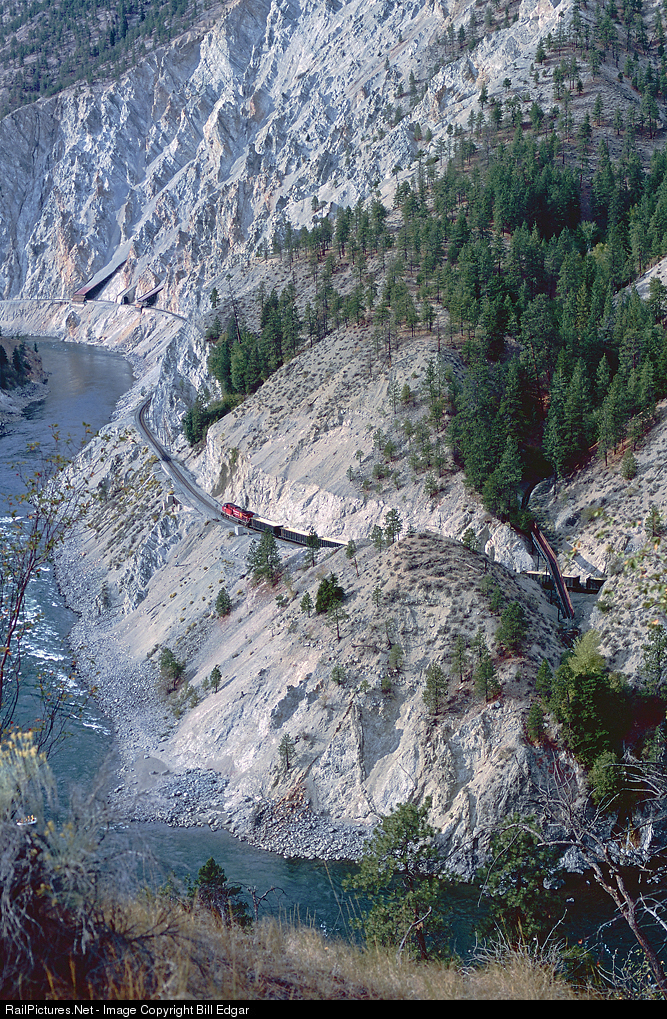 | Only in Canada? A CP sulfur train rolls west on CN trackage above the Thompson River as it nears Lytton, BC. This area of the canyon is especially challenging for CN to maintain. the train is going UNDER a creek, through a tight curved cut, and approaching sheer cliffs and a trio of slide sheds/tunnels designed to keep the perpetual debris off the tracks. CN often has a work train assigned out of Spences Bridge to come to this location to clear bebris not handled by the sheds. Just around the corner from the shed the train will go through a short tunnel as it winds its way toward Lytton. |
