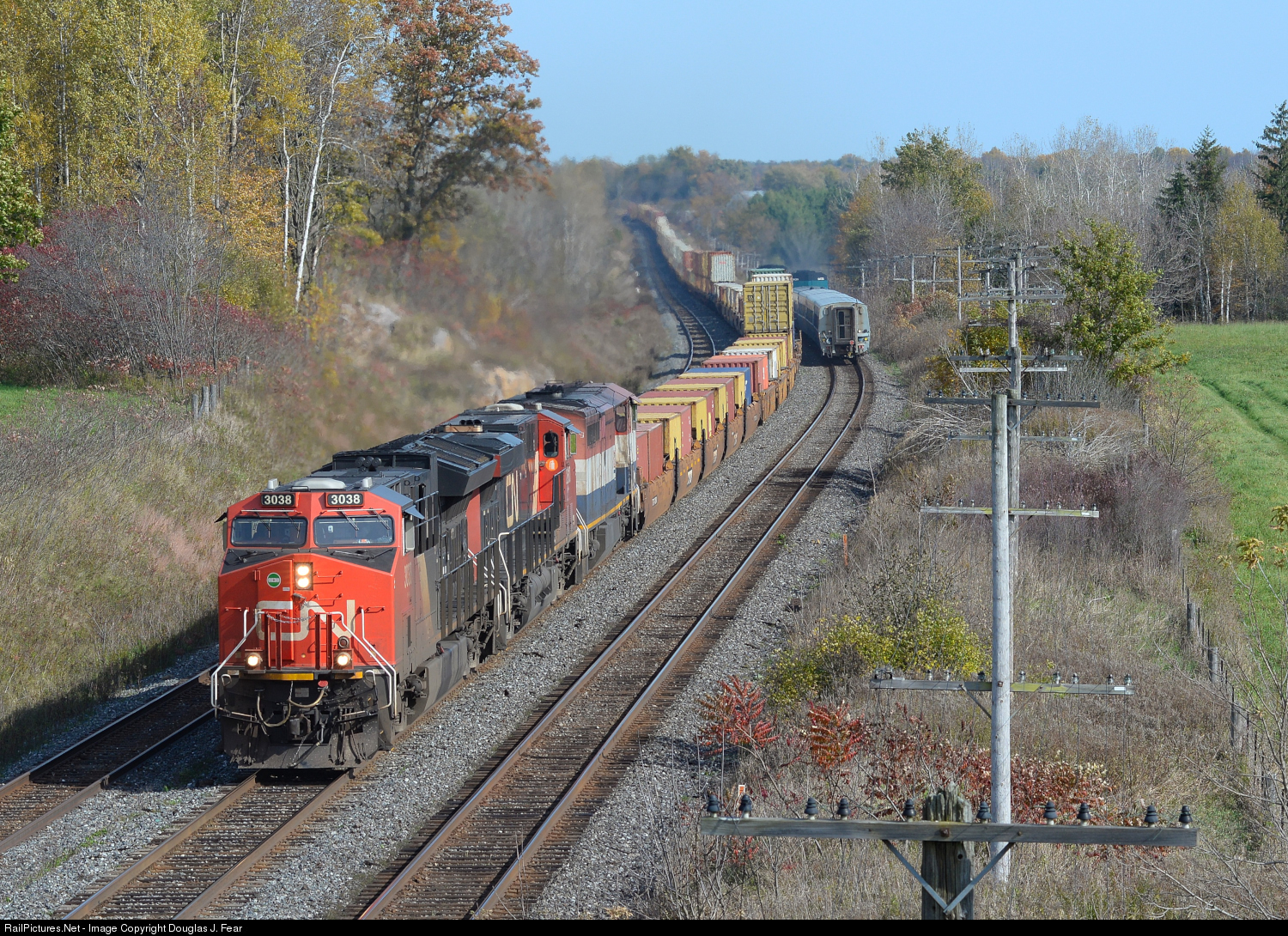 A pair of CN ET44AC's and an ex-BC Rail Dash 8-40CM lead train CN 149 as a combined 2-train VIA passes on Track 3. As a standard VIA practice, the train will be split at Brockville, with the tail section heading to Ottawa while the head-end continues to Montreal.