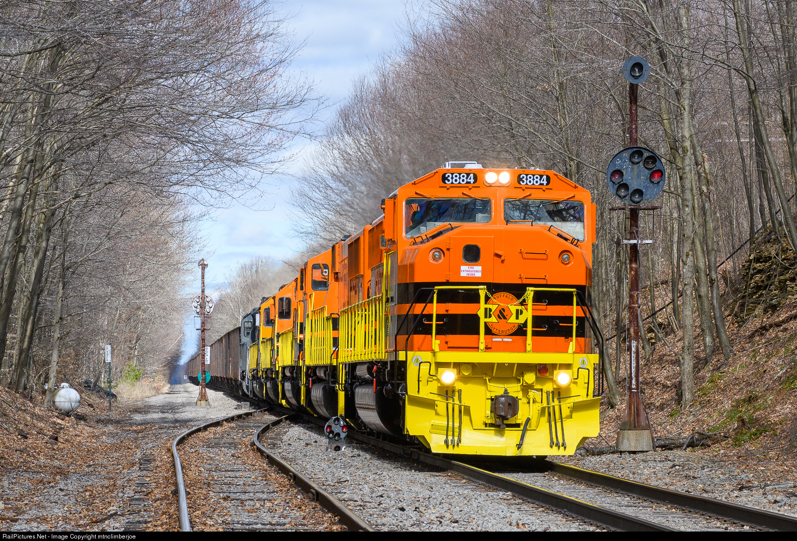 | With freshly painted SD60I 3884 on the point, Buffalo & Pittsburgh X-STONE rolls through CP Boyer in Mount Jewett, Pennsylvania past the B&O CPL governed CTC Island. The pair of SD60I's on the point were taken from the coal train that was tied down in the siding and sent to rescue the stone train, which had stalled on the grade in Lewis Run due to issues with leading SD50 5020. |