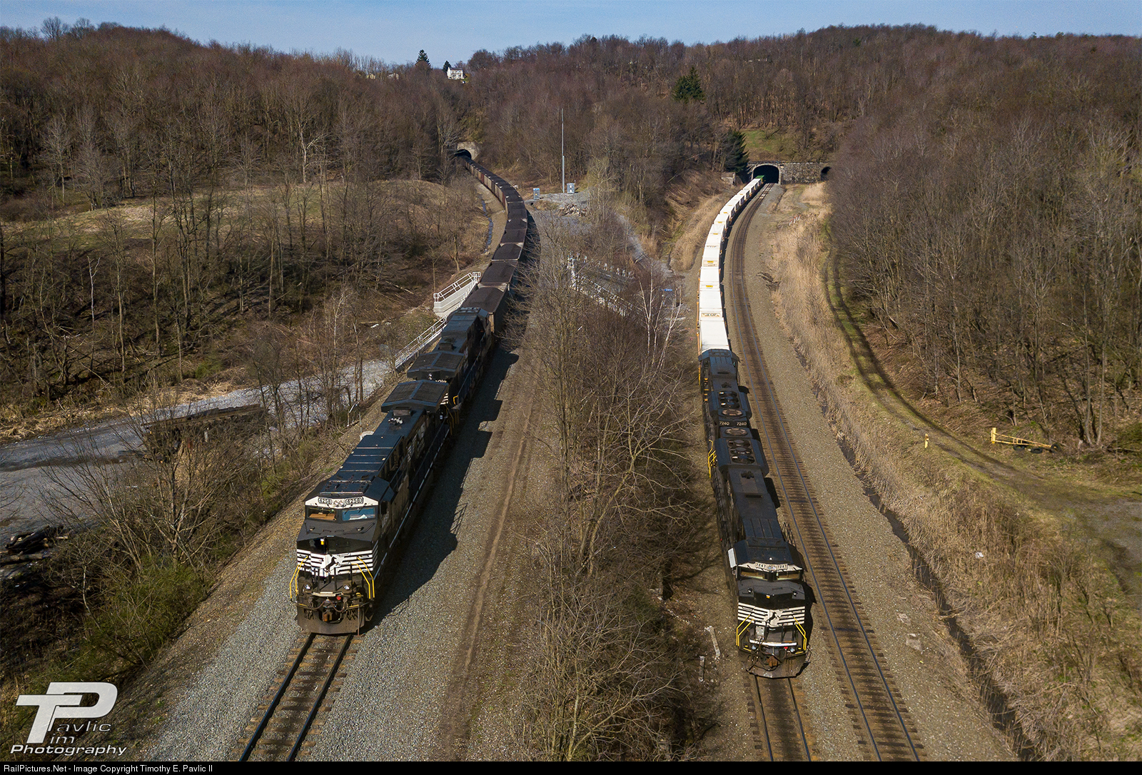 After exiting the New Portage Tunnel, loaded eastbound coal drag NS 590 sits stopped with the head end just past the old SF duck under. 590 is in emergency, having had a separation 69 cars back as it began its decent over 'The Slide,' a steep, one-and-a-half mile grade from CP AR to what was once (under Conrail) CP Benny at Bennington Curve.