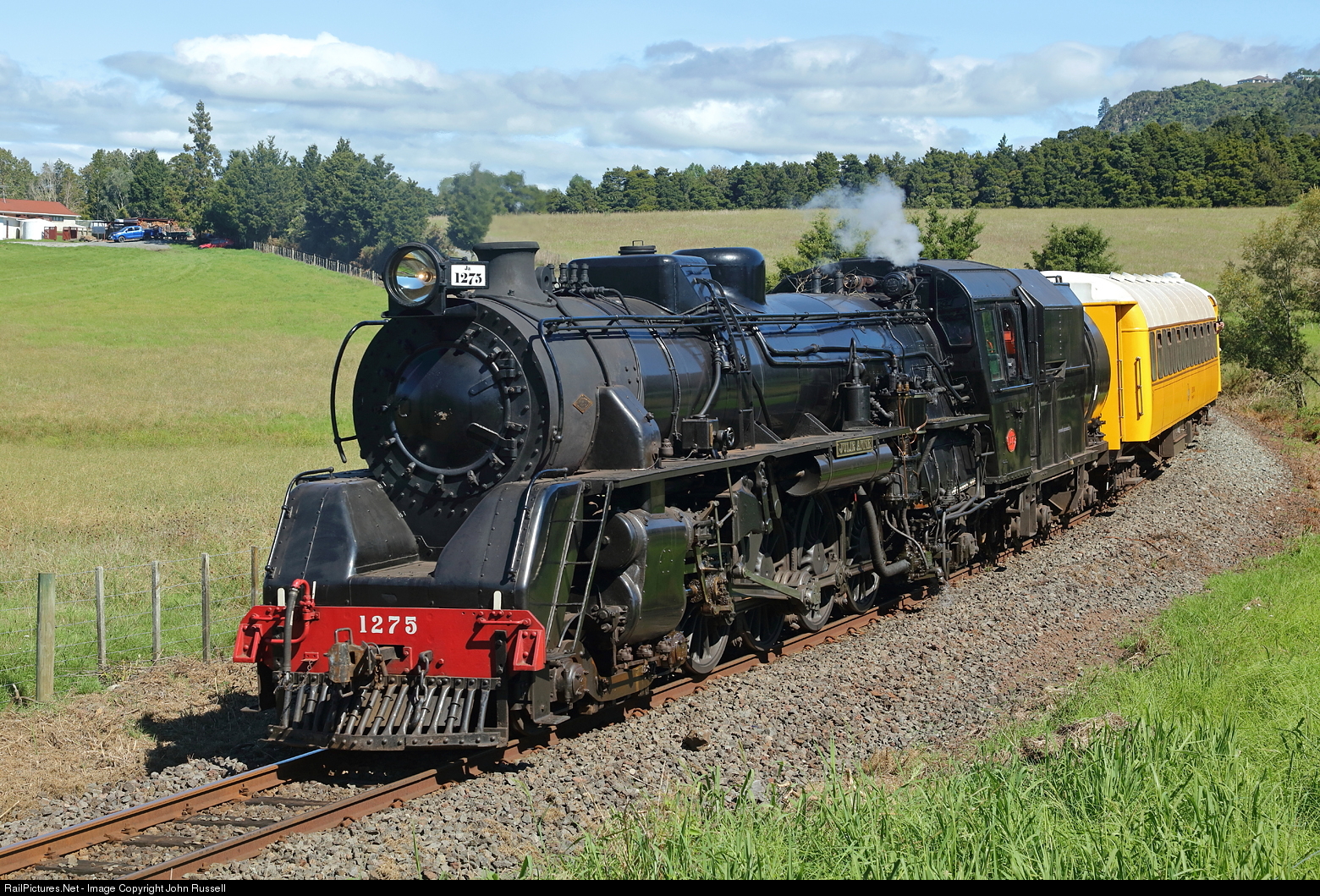 1275 was built by North British, Glasgow and was in service from 1952 to 1967. After restoration 1275 returned to main line in 2004. The train consisting of rolling stock based at Glenbrook Vintage Railway participated in fundraising trips from Whangarei to Portland and Kauri. The train is nearing Kauri, the northern extremity of the KiwiRail network.