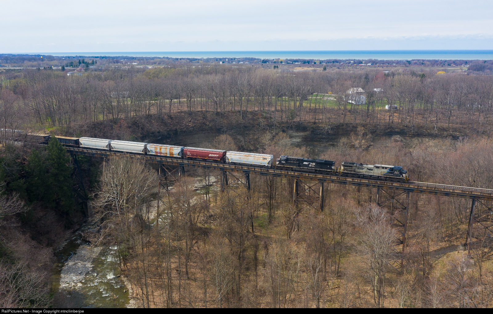 With DC-to-AC mane unit 4004 in the lead, NS 310 crosses over the Twentymile Creek gorge in North East, Pennsylvania on the former NKP mainline. The tracks are only a few miles south from the shore of Lake Erie.