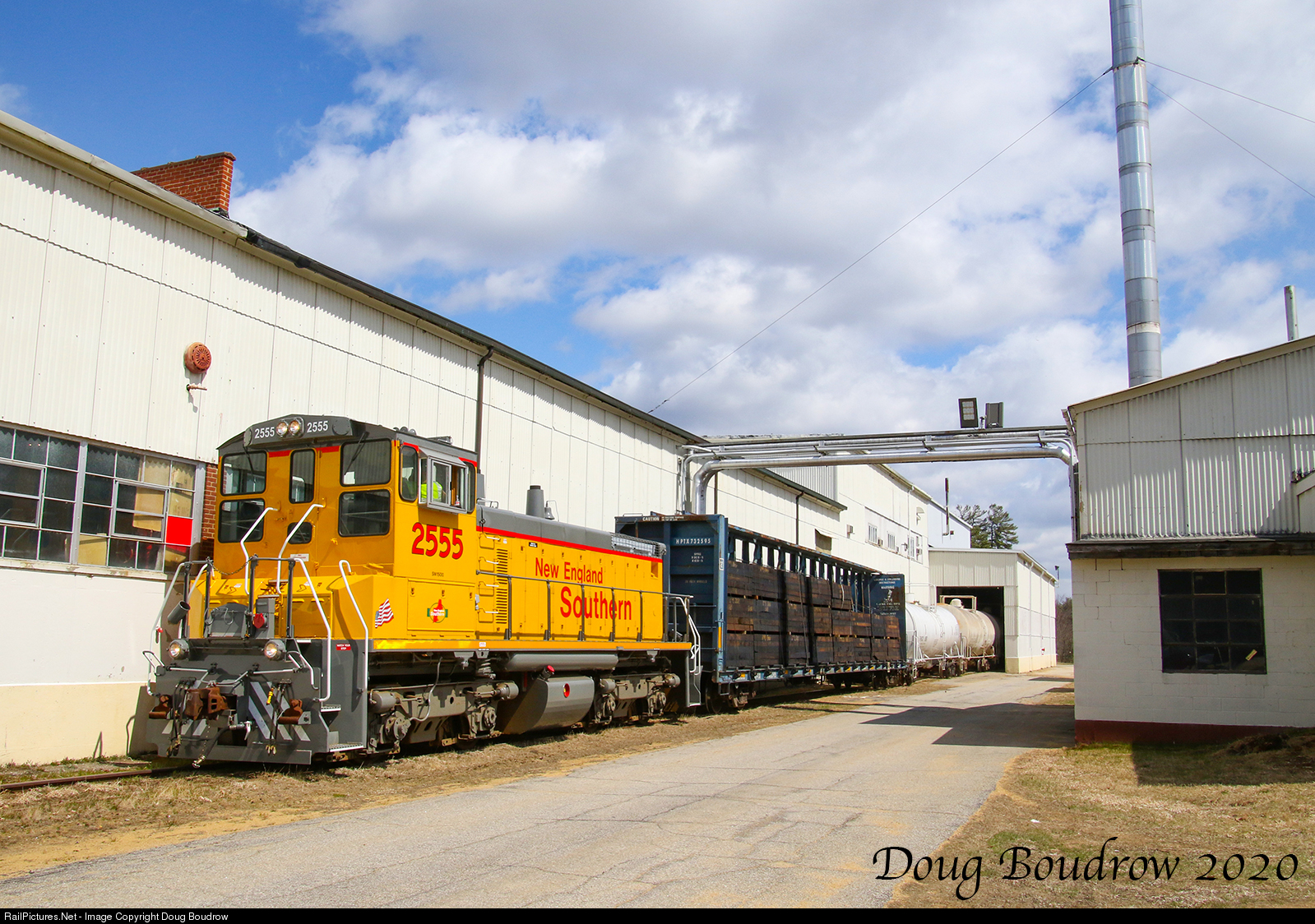 | New England Southern is seen switching out cars at 3M in Tilton. The spine car of ties is for a tie replacement project on the Plymouth & Lincoln. A cut of five others has already been set off on the siding at Lochmere just a couple of miles North. The EMD SW1500 was originally built for the Southern Pacific in January 1970.