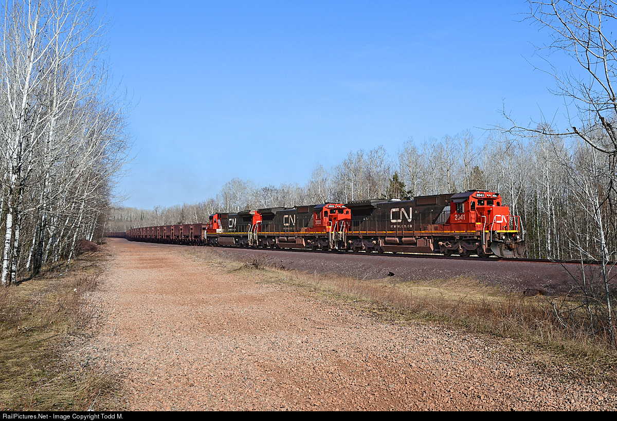 | Navigating the S-curve CN 2041 north is taking the turn on what was the former DM&N, then DM&IR and now the CN Iron Range Sub passing by the grade of the former D&IR which was abandoned in 1972. |