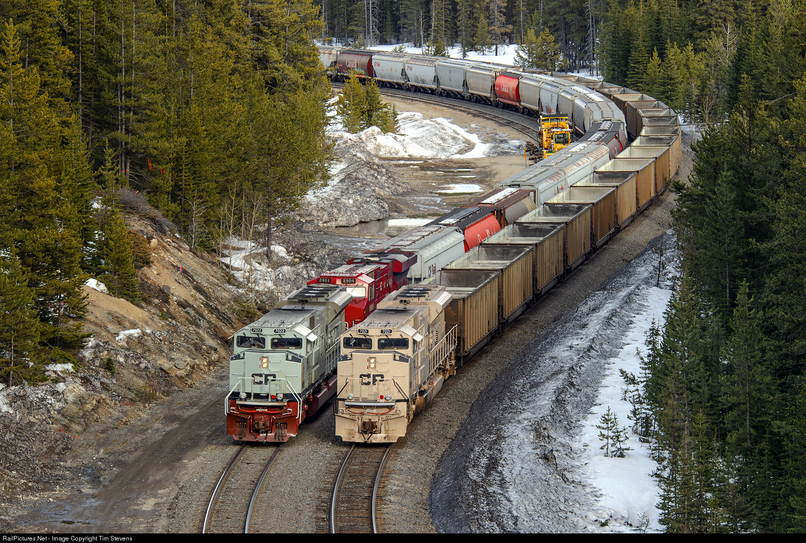 | Loaded grain train 303-600 with CP's "Navy" military themed SD70ACU 7022 on the point is stopped at Stephen as empty sulphur train 608-015 passes by on the south track with CP's "Army Arid Regions" military themed SD70ACU 7021 shoving on the tailend. |
