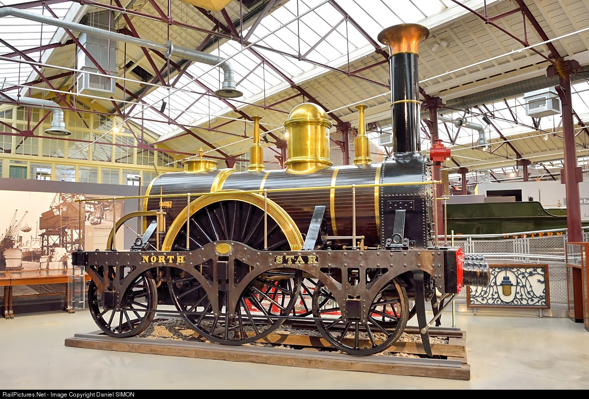 | North Star is a broad gauge locomotive. It was built in 1837 for the New Orleans and Carrollton Railroad in the USA by Robert Stephenson and Company. The locomotive was intended for use on a new 130 mile route to St Francisville, Louisiana. The route was cancelled, but North Star was still shipped to the USA. It was destined for a broad gauge railway in New York but was never unloaded, and was returned to the UK. GWR purchased the locomotive and had it modified to run on the GWR's broad gauge. North Star was delivered to the GWR on 28th November 1837. North Star was rebuilt with new cylinders and a new boiler. The engine was scrapped at Swindon in 1906. This full size replica was built at the Swindon Works in 1925 to the 1837 specifications. It was built to celebrate 100 years of the railway. With four other GWR locomotives, it took part in the Stockton and Darlington Railway Centenary Cavalcade. The replica uses some parts from the original locomotive. |