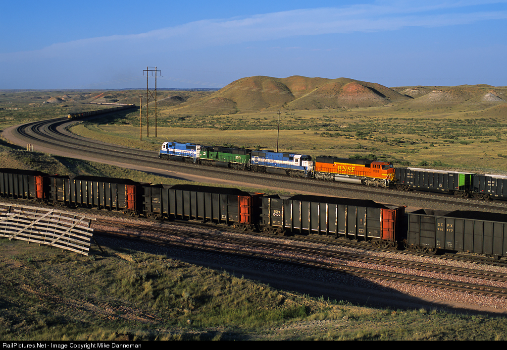 Led by Oakway Leasing EMD SD60 No. 9019, a northbound Burlington Northern Santa Fe coal empty cruises through Converse Junction, Wyoming, on the afternoon of June 29, 2002. The train will be meeting a southbound Union Pacific load seen approaching, that will soon be slowing as it works hard on the grade over Logan Hill. In the foreground is a SEPX coal train that will be departing shortly for a trip south on the Orin Line.