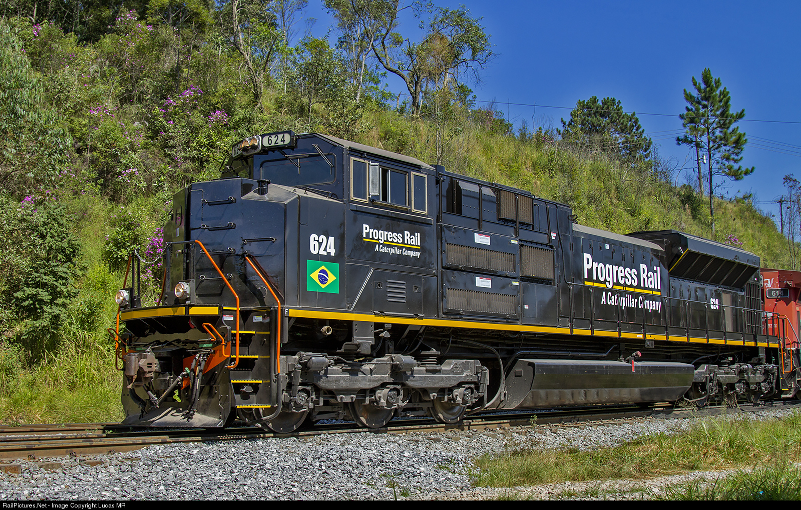 | Southbound I88 led by former ALL SD70ACe #624, now in Progress Rail paint scheme, being tested in a Rumo train. |