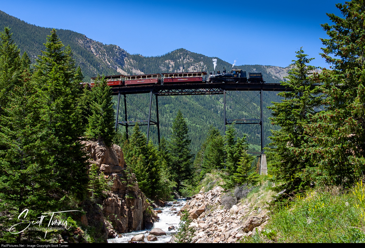 It's a beautiful mid-summer morning as former Westside Lumber Company Shay #12 backs its train over the Devil's Gate high bridge headed for Devil's Gate station on the Georgetown Loop.