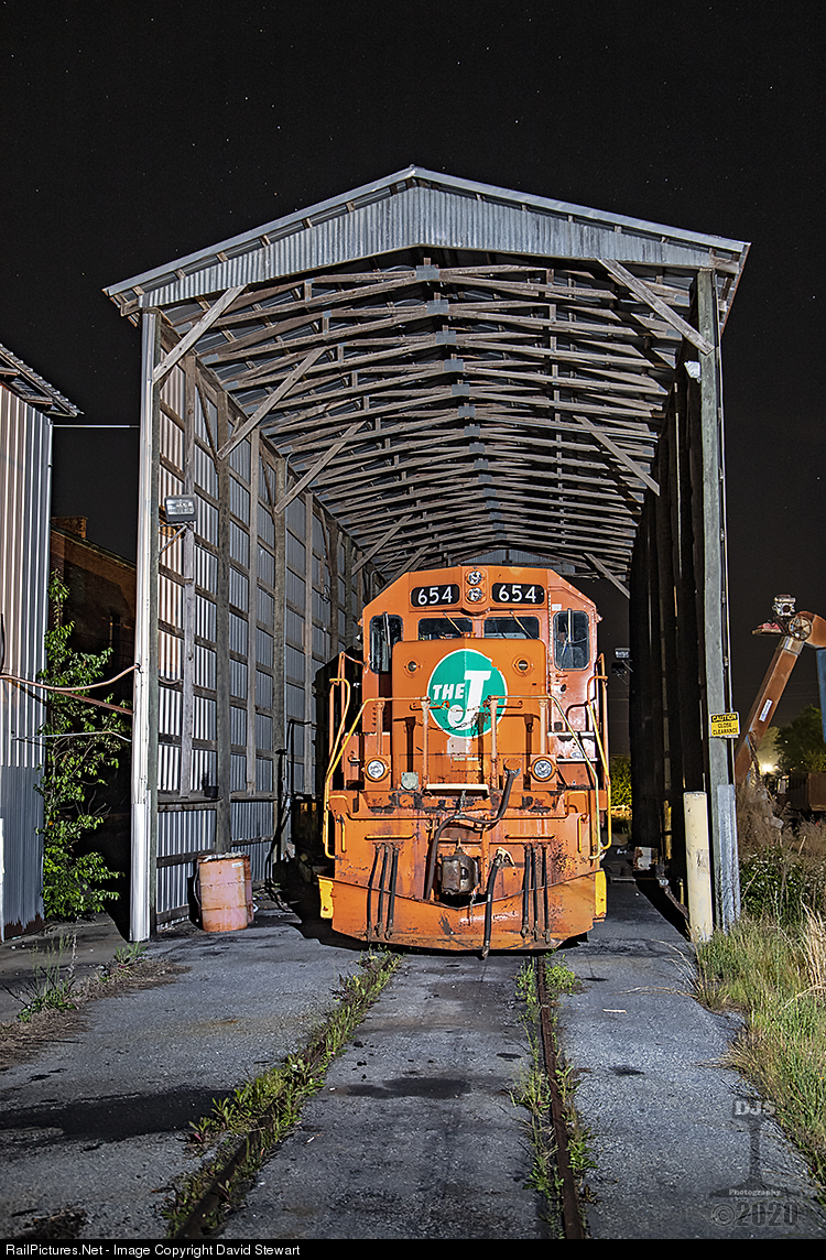The Hartwell's ex EJ&E SD38 NÂș654 stands in Lavonia, Georgia on the night of April 25, 2020 after having some electrical repairs done earlier in the week.