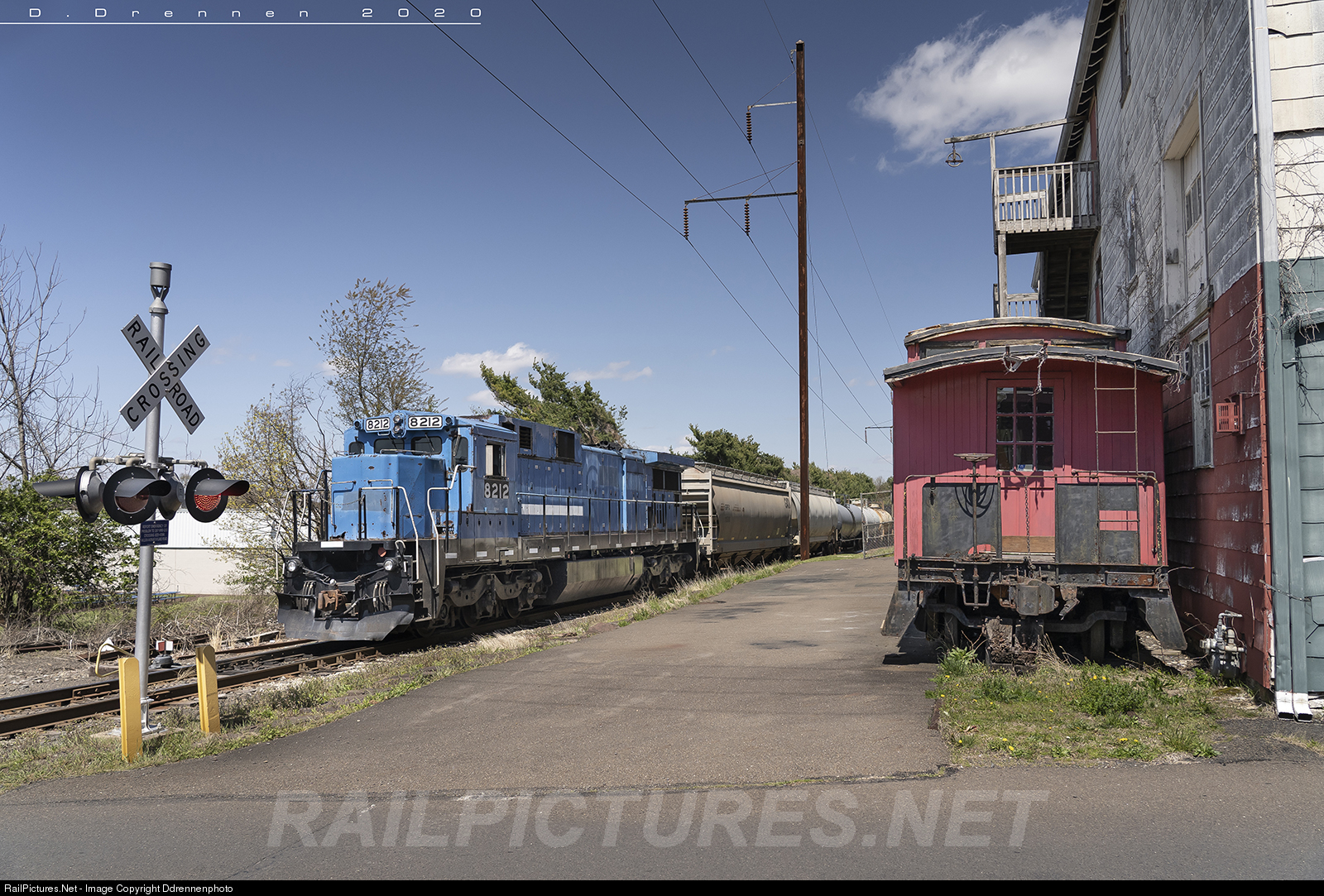 PN 8212 Passes an old freight house in Ivyland, Pa. an old caboose sits retired along side on what was a siding at one point.
