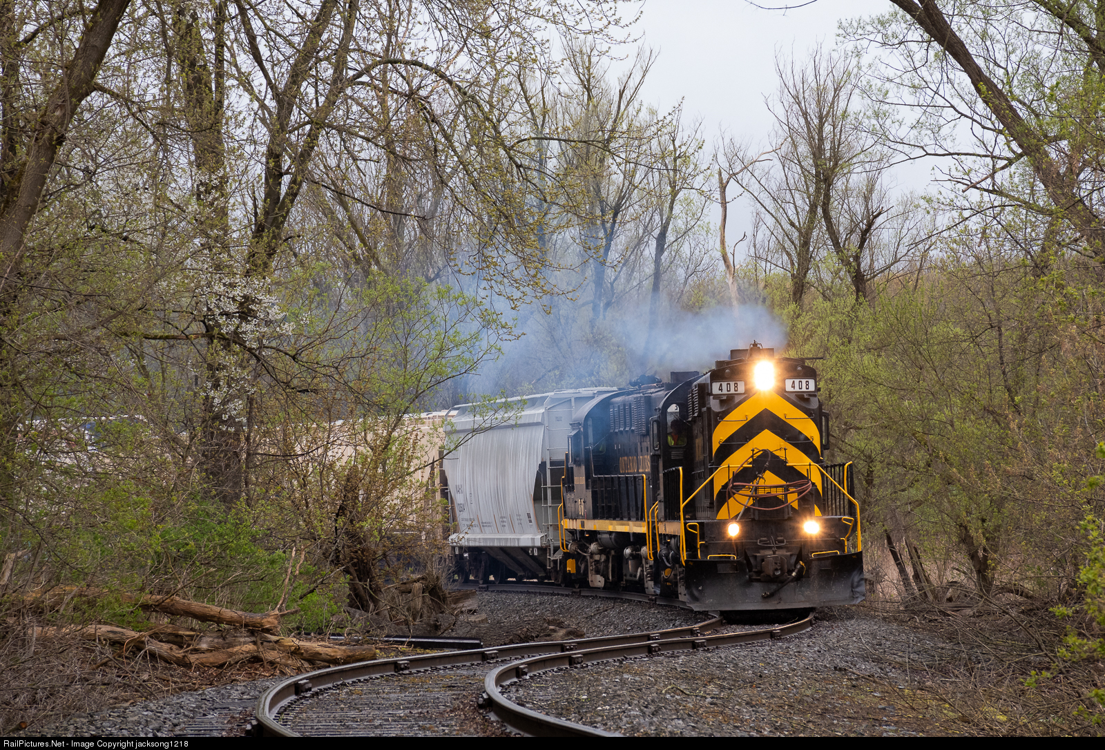 During a May rainshower, a rare doubleheader on the OMID occurred when the ex - N&W ALCO's number 408 (RS-36) and 36 (RS-11) work hard to pull 12 inbound cars up the steep and winding grade from the CSX interchange to their mainline.