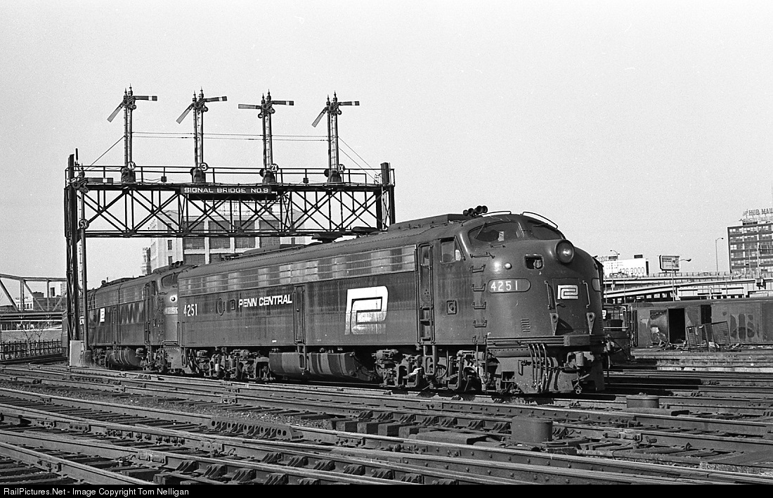 A pair of ex-PRR E8s lead a Penn Central Providence-Boston commuter train under one of the semaphore signal bridges that guarded the approaches to Boston's South Station. These lower quadrant semaphores dated to the terminal's opening in 1899 and lasted until it was reconstructed in the mid-1980s.