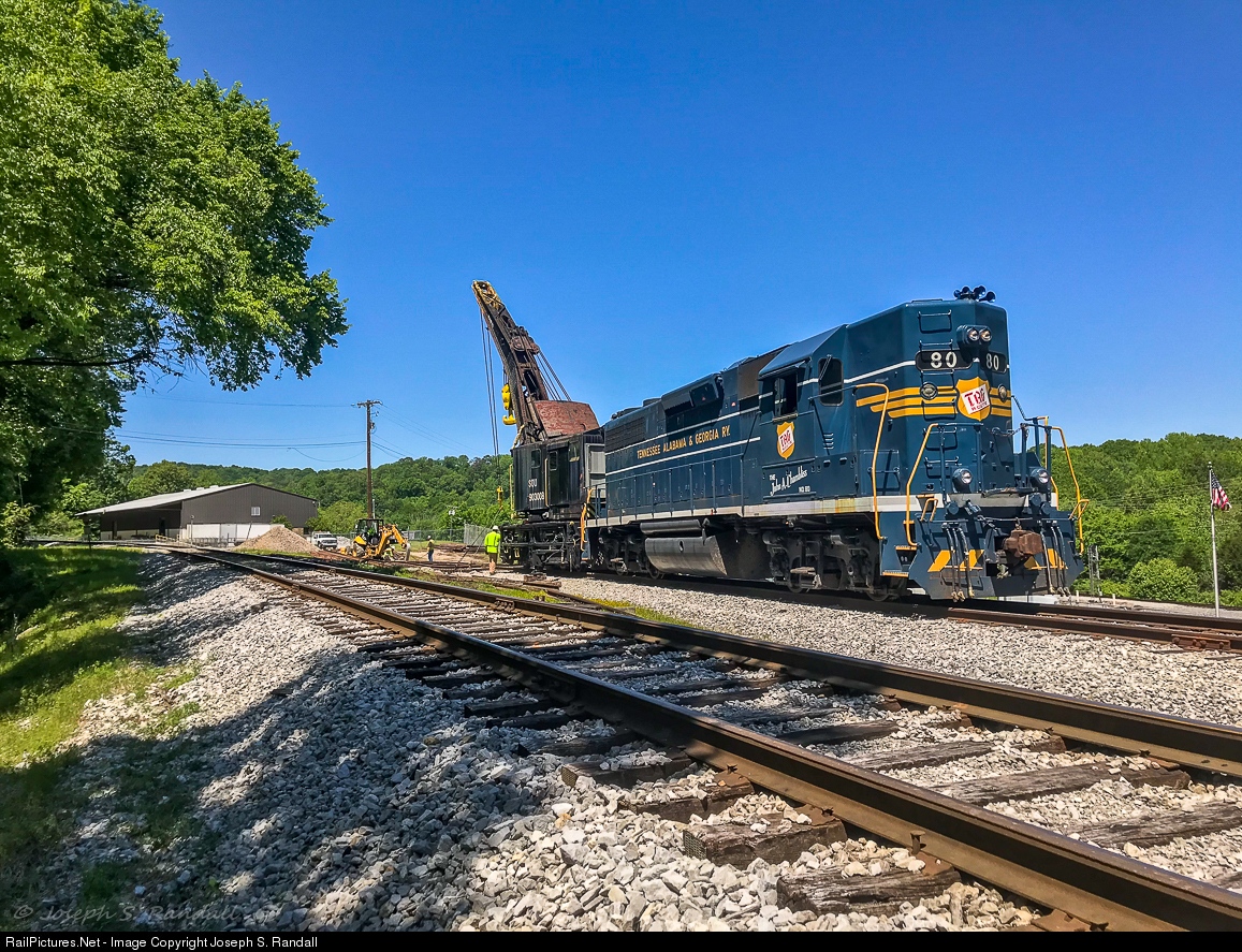 The power that brought the Derrick over was TAG 80, a EMD GP38 that was originally built for the Tennessee, Alabama & Georgia Railway (The TAG Route) in 1968. It is also believed to be the first production high hood GP38-series locomotive. It was used to bring the Derrick over & to help supply air to the main reservoir that powers some of the appliances.