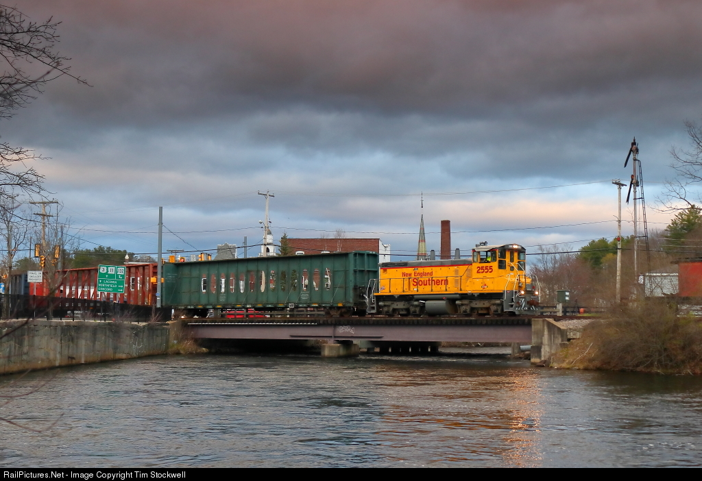 | New England Southern SW1500 #2555 leads its train south across the Winnipesaukee River in Tilton, NH on former B&M rails. |