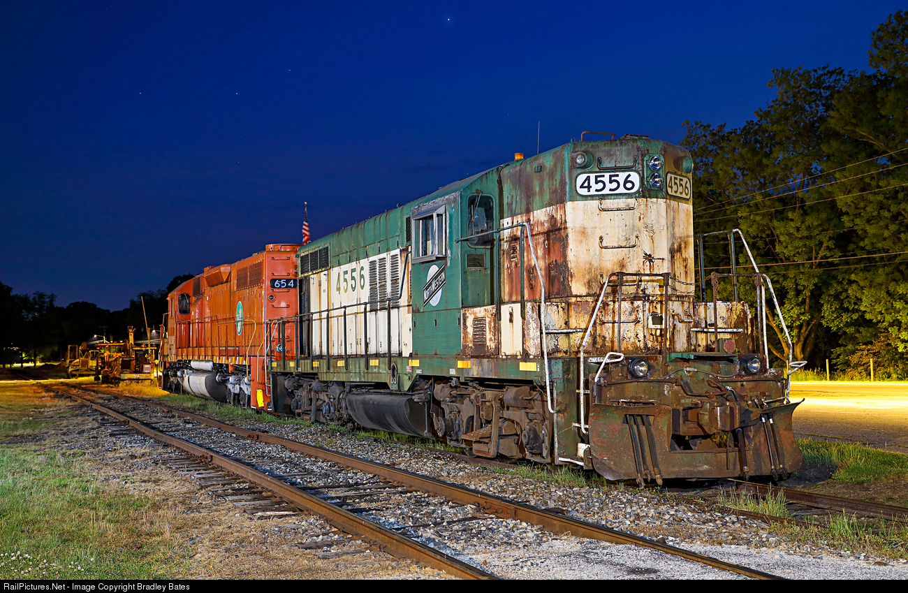 Former C&NW now HRT GP9 #4556 and former EJ&E now HRT SD38 #654 are seen here resting for the night in Bowersville, GA.