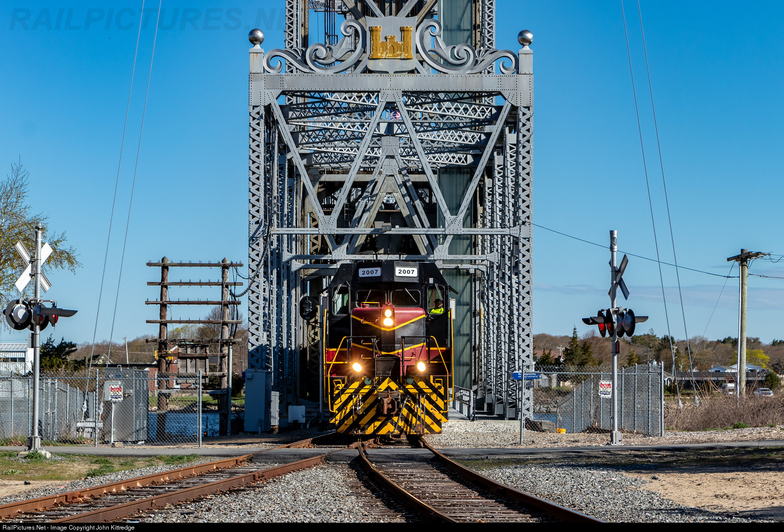 Mass Coastal Railroad GP9u 2007 crosses the massive 544ft lift bridge over the Cape Cod Canal, entering Cape Cod from the mainland.