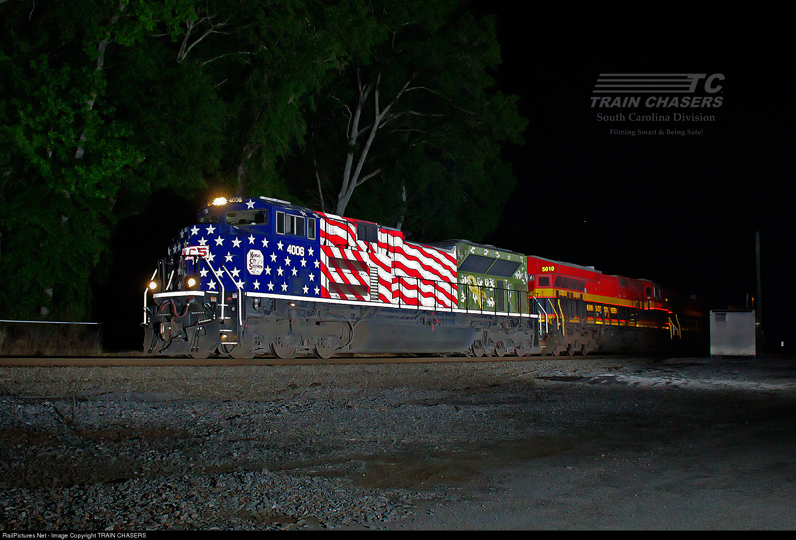 | NS 219 / KCS IATDA makes a westbound run in Mableton, GA at 11:45 PM with the KCS #4006 EMD SD70ACe ( Honoring Our Veterans ) Unit leading along with four more KCS locomotives trailing behind heading for Dallas, TX. |