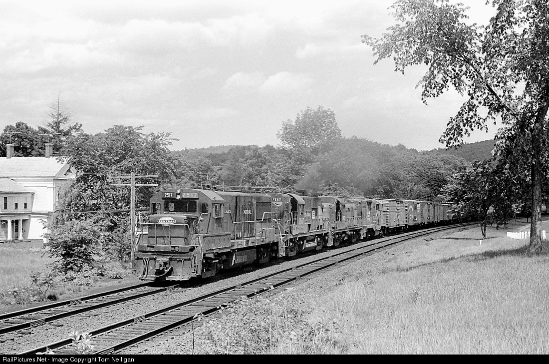 A mix of former NYC and NH power leads Penn Central train NS-1 (New Haven/Cedar Hill to Selkirk via Springfield) through Beckett, MA, on a summer afternoon. An ex-NYC U25B leads an RS-11, RS-3, and GP9 from the NH.
