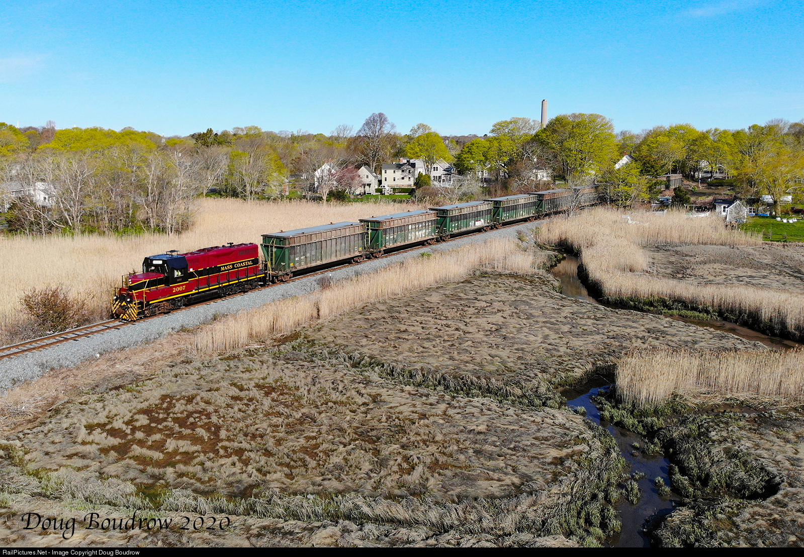 Mass Coastal Railroad operates the energy train five days a week. The empty train travels from Rochester onto Cape Cod where it picks up trash from a facility in Yarmouth. The loaded train returns to Rochester where the trash is burned to fuel a power plant. The empty train is known as MC-1 while the loaded train is MC-2. An earlier than usual MC-1 is seen passing through the salt marshes in Sandwich. The GP9 was built new in 1956 for the Atchison, Topeka and Santa Fe Railway.