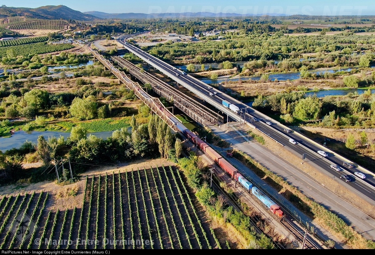 | Intermodal train 50.009 Santiago - Talcahuano of FEPASA railroad crosses the massive Maule bridge, at the southern exit of the Talca city. Next to it you can see the old railway bridge. |