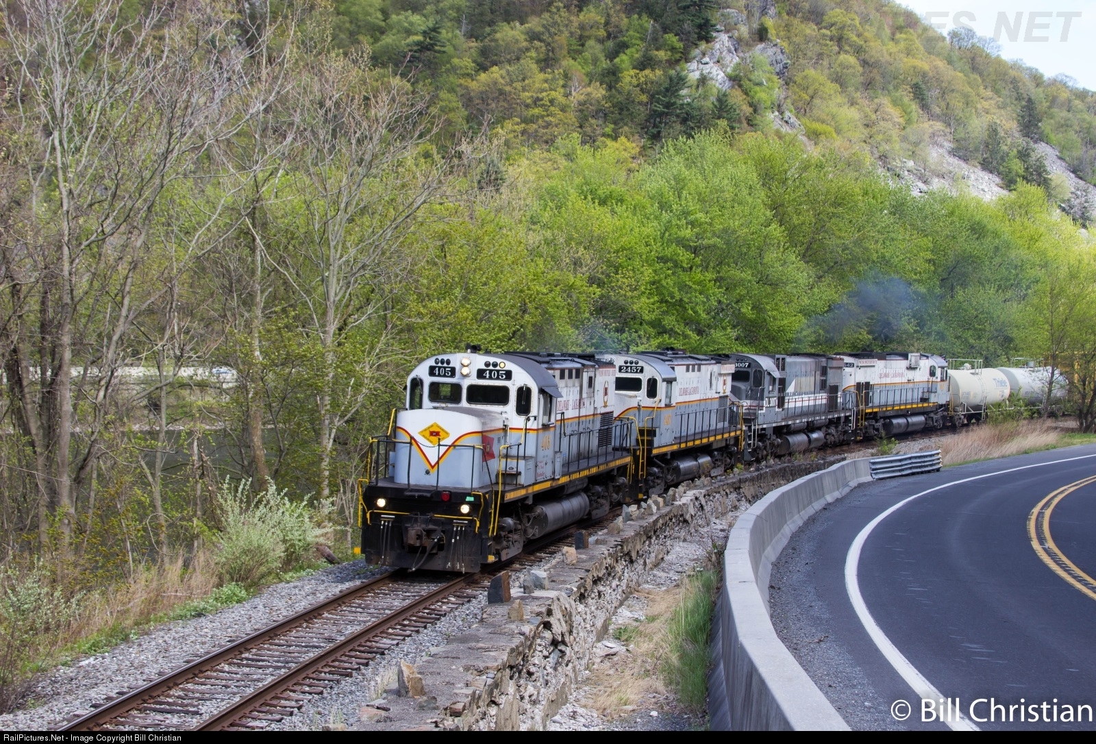 | Delaware Lackawanna PO-75 heads west past Point of Gap in the Delaware Water Gap. Since the interchange with NS has moved to Taylor, seeing the DL in the Gap is a rare treat as they only come down once every two weeks or so to service Rock 10. |