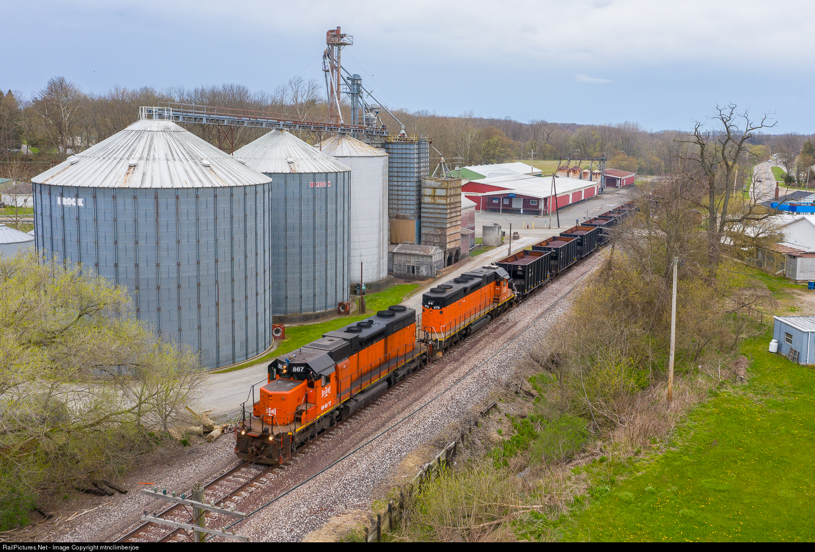 | The grain elevator at the Conneautville Farmer's Exchange stand in the background as southbound ore train CN U702 passes through Conneautville, Pennsylvania behind a pair of Bessemer & Lake Erie SD38's. |