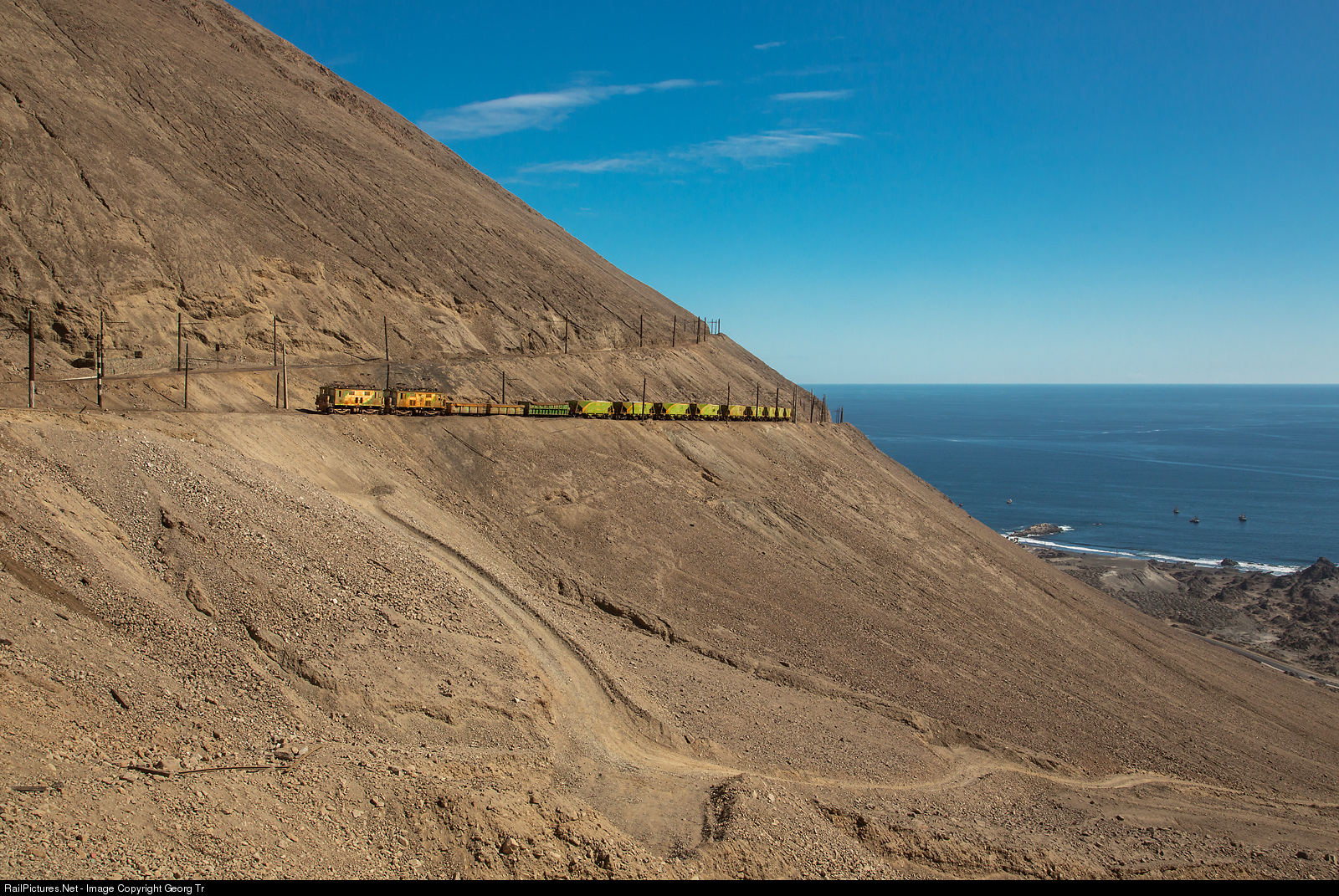 | The two vintage "boxcab" locomotives 289A # 601 and # 607 in multiple traction are reaching the switchback station Reverso with an empty train from Tocopilla. Here the locomotives will go around the train for the journey up to Barriles. The SQM (Sociedad Quimica y Minera de Chile) had 7 of this 66 ton boxcab locomotives, which were built in 1927 by General Electric in Schenectady/New York. The "cap gauge" (1067 mm/3 1/2 ft) "Ferrocarril de Tocopilla a Toco" (FCTT) was openend in 1890 with steam traction, the operation ceased in 2015 after heavy flood damage. Over the very steep "road" in the foreground we reached Reverso station with our 4x4 vehicles. |