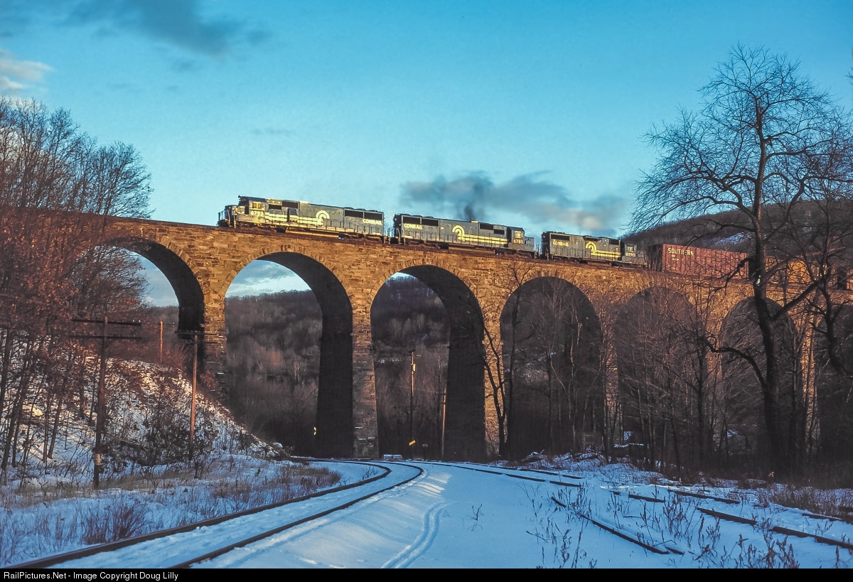 | On the shortest days of the year, the one of the last places of the day to get light on a train on the Southern Tier is on the Starrucca Viaduct. Viewed from the shadowed Delaware & Hudson Penn Division, Conrail train BUOI (Buffalo – Oak Island) crosses the storied stone structure just a minute or two before it joins the Penn Division in darkness. |