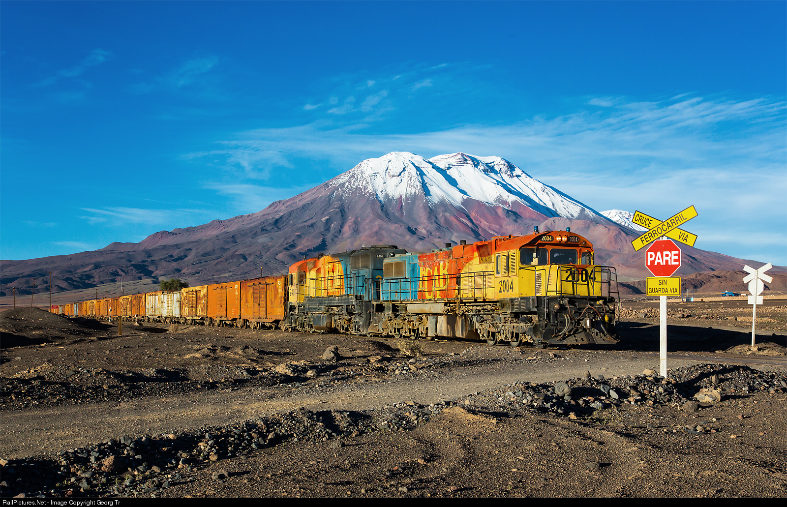 The daily boxcar train from Bolivia, with cars of the EMPRESA FERROVIARIA ANDINA S.A (with the former inscription of FCA=Ferrocarril Andino) is running through San Pedro on the way to Calama and the harbour of Antofagasta. As far as I know, mineral concentrate (loose bulk!) is transported out of Bolivia in these cars, the loading possibly takes place in Poopó, 48 kilometres south of Oruro and in Agua da Castilla (Porco mines) on the Potosí branch. The train is pulled by the Former Queensland Railway GL26C-2 # 2004 and former Columbia (FNC) GT22CU-3 (rebuilt GR12) # 2404 of the FCAB (Ferrocarril de Antofagasta a Bolivia). In the background is one of the tallest active vulcanoes of the World, the 6145 meter (20161 feet) high San Pedro. Last outbreak was in 1960, presently the volcano is fumarolically active. Here we are about 3230 meter a.s.l. an there are about 320 kilometer through the Atacama desert to Antofagasta.